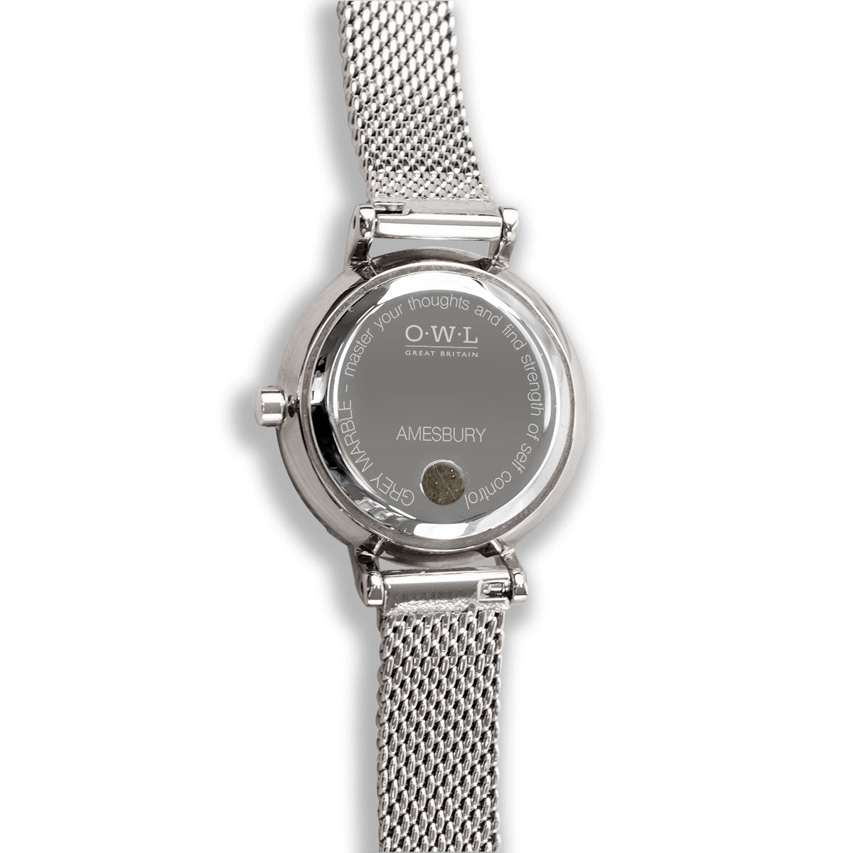 A specially selected slim Japanese Miyota movement from Citizen ensures that the Amesbury feels light and feminine, while allowing for the back of the case to be set with a piece of stone that stays in contact with the skin, as well as an inscription of its natural healing properties.